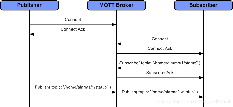 又如下图所示,下图展示了发布者与订阅者使用MQTT经纪人进行的简单交互。如图所示,信息创建者(producer)连接至MQTT经纪人。同样,信息消费者(consumer)连接至MQTT经纪人。消费者订阅主题(此处定义为/home/alarms/1/status)。本示例主题可识别主页上针对区域1的警报系统的状态变化。当创建者有信息要分享时,它会向经纪人发布一条消息,然后经纪人将会将信息分享给所有订阅该主题的用户。